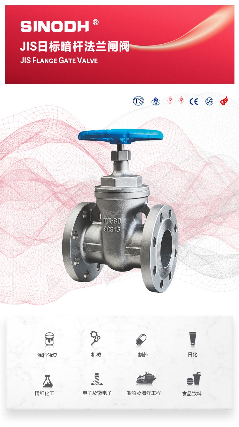 JIS日标暗杆法兰闸阀,为同花顺官方网站自主研发生产。本产品设计制造标准符合JISB2071标准,该产品是一种最常见的启闭阀,利用闸板的上下工作来接通(全开)和截断(全关)管道中的流体介质。