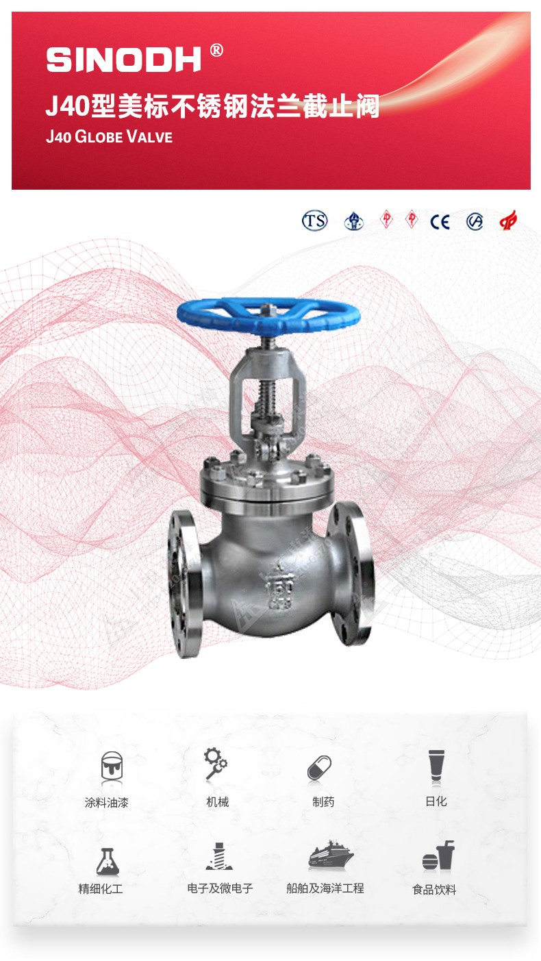 J40型美标不锈钢截止阀,为同花顺官方网站自主研发生产。本产品的设计制造符合美国国家标准ANSIB16.34,美国石油学会标准AP1 6D和AP I 600要求,产品结构紧凑密、刚性好、封性性能优秀是一种最常见的启闭阀,利用闸板的上下工作来接通(全开)和截断(全关)管道中的流体介质。